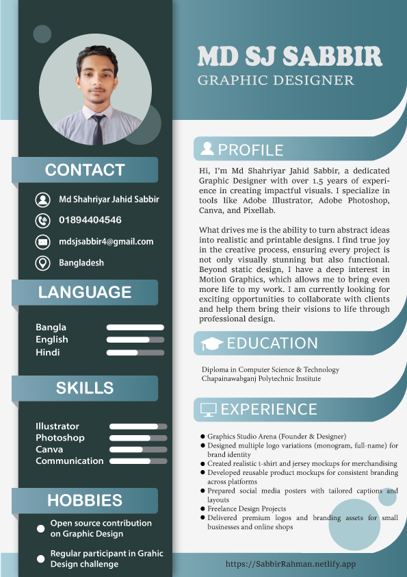 "Hi! 👋 I am Md Shahriyar Jahid Sabbir, a professional Graphic Designer with over 1.5 years of experience 🚀 in creating high-impact visual designs. I specialize in turning creative concepts into polished, professional results that help businesses and individuals stand out. ✨